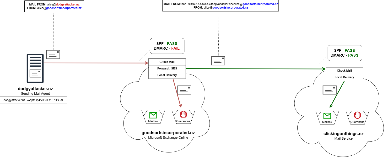 Rewrites the MAIL FROM header to: bob+SRS=XXXX=XX=dodgyattacker.nz=alice@goodsortsincorporated.nz